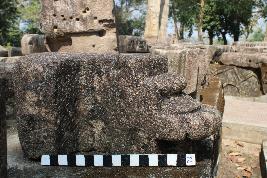 | Description / विवरण | This is an architectural fragment of a temple. Sockets of iron clamps are present on the top. There is an amalaka-like motif present on the left side of the frontal portion. Whereas the frontal part is devoid of any decoration. |