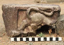 | Description / विवरण | It is a broken animal figurine that could identify the back part of the animal which is clearly seen. The top portion of the architectural fragment has five iron-plugged sockets. It could be identified as an animal panel that has been broken. The hindlimbs are present and the tail is carved upward direction. At the hip of the animal, an undulated spiral design is carved. The front part is broken. |