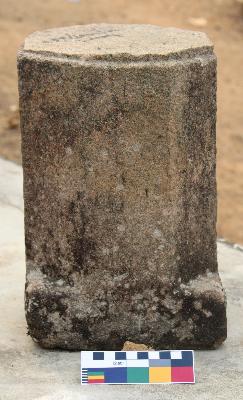 | Description / विवरण | This is an octagonal pillar part of temple architecture. The pillar has a plain surface and the bottom of the pillar is a square shape but partially broken. |