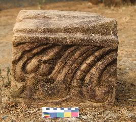 | Description / विवरण | This is a broken architectural member with a floral design on it. The top surface is plain and one of the sides is having the five dowels marking, along with that there is an inscription carving on it. The mason marking is seen carved on one side. |