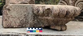 | Description / विवरण | This is a broken cornerstone of a temple. An amalaka attached with Chandrika and amalasarika is carved in one corner of the fragment which is at present placed in reverse position. There is a dowel mark on the top of the fragment. |