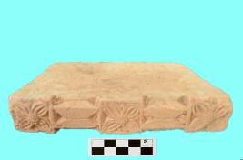 | Description / विवरण | A full-sized brick with floral decoration. Three full bloom flower designs are curved in the frontal side of the brick. Each flower has four petals in cardinal direction having convex carpel in the mid. The flowers are curved within a square box. The flowers are separated by two rows of horizontal trapeze bands. The minutely ornamented brick must be used in the basement molding of temple or other religious structure. |