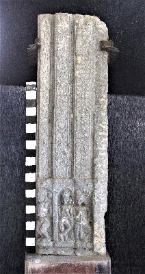 | Description / विवरण | The stone pillar represents a door jamb of the temple placed vertically. It has a three-projection architecture which represents three different figures sculpted on the lower part of the door jamb. The figures are shown in standing postures adorned with ornamentations. The first figure seems to be a temple attendant standing with devotion bending his knees while his feet touch the pedestal, hands showing namaskar mudra. It is adorned with circular kundalas and a headgear, wearing an antariya reaching its knee. Other representations are highly eroded. The figure sculpted in the middle stands in tribhanga posture, its right hand is folded towards its chest holding an unrecognizable object, adorned with elongated kundalas and decorative headgear. The facial representations are highly eroded. The third figure is standing with a right knee bending outwards with its foot placed on the pedestal. It is adorned with circular kundalas and decorative headgear, and the left arm of the figure is folded toward the chest holding an unidentified weapon. The upper part of the architecture is sculpted with highly decorative floral motifs and creepers in vertical lines. |