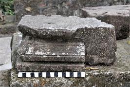 | Description / विवरण | It is a square shaped broken architectural block consisting of one shallow soket on its top surface. The block has carvings of sunken relief vertical layers on its frontal sides, while the other two sides consisted of flat surface with no carvings. The middle section of the structure has been beatifully carved from inner part towars the outward surface diagonally having thin impressions of strip lines on it. |