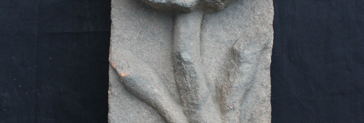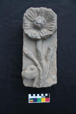 It is a lotus floral carving in a rectangular shaped high relief. It has a full bloom flower and on the left, there is a tilted bud and a drooping half bloom. On the right it has a single bud.