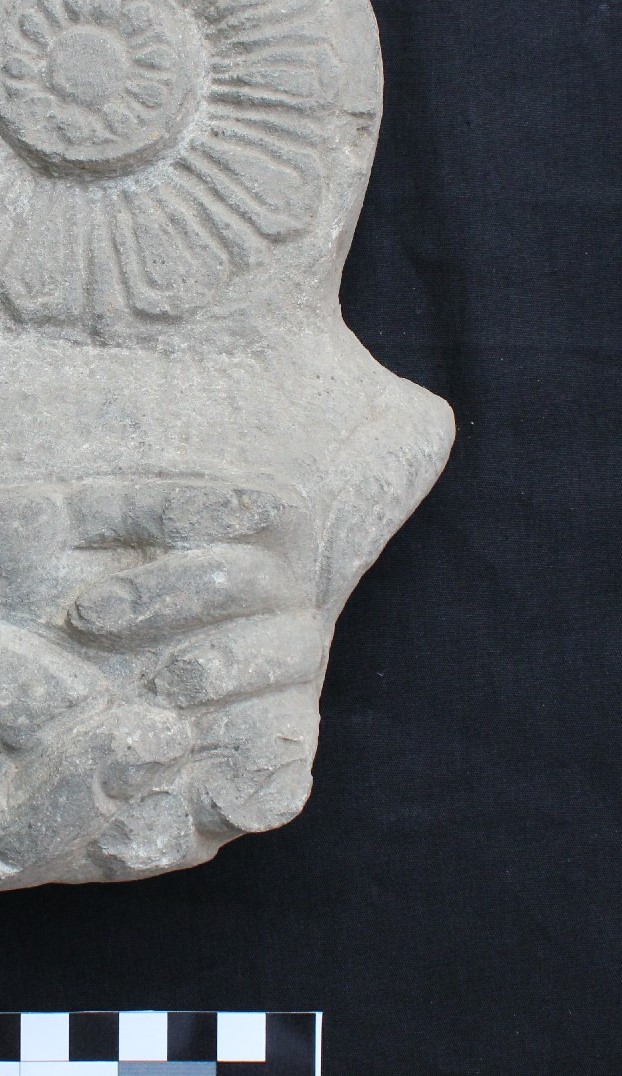 It is a fragment a scuplture carved on a medium-grained granite. On observation, one can see that the image is carved in a high relief. The fragmented piece has a clutched hand and a full bloom lotus emerging from behind the hand. It is a left lower hand holding onto an unidentifiable attribute (Ayudha). Given the size of the hand, the piece is certainly part of a large-sized sculpture.