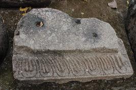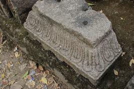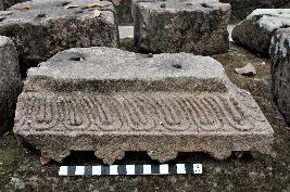 | Description / विवरण | It is trapezoid shaped broken architectural fragment having low relief carvings of decorative floral leaves ornamented with beaded strings carved out in a row. The base is decorated with scroll like patterns alligned in a row. The entire carvings and decorations were seen only on two sides of the structure, while the other two sides have flat surfaces with no carvings. The block has three square shaped shallow soket on its top surface. |