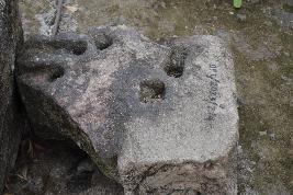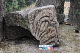 | Description / विवरण | This badly broken decorative block, represents low relief carvings of floral petals enhanced with beaded strings. The decorative elements were seen only on the frontal side of the block. The top surface has carvings of square shaped shallow sockets along with clamp impressions on it. |