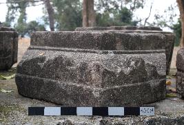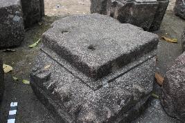 | Description / विवरण | This is an eroded broken architectural fragment. It is trapezoidal in shape having two shallow circular sockets on its top surface. It has been beautified with conical shaped scroll like floral petals on three sides of the structure in an alignment. |