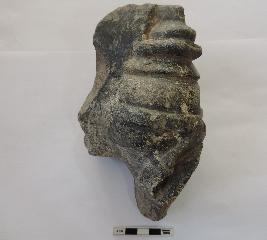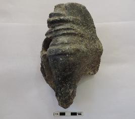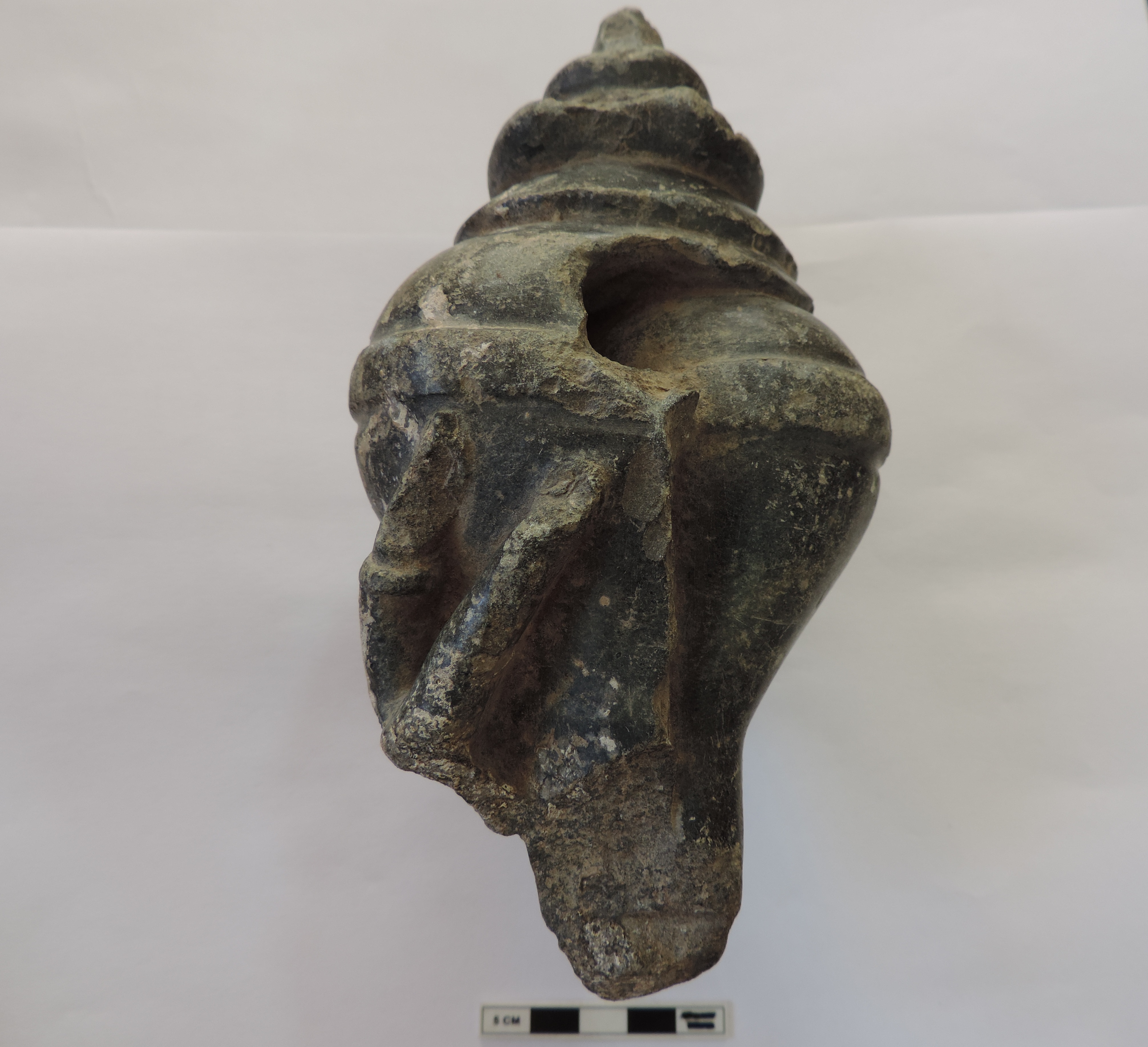 A conch being held by someone. Two fingers are visible at the bottom holding the conch. The upper finger also seems to be wearing a ring.
