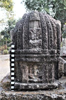 | Description / विवरण | This architectural fragment represents a nagara style sikhara of a temple consisting of a polygonal dome like structure decorated with horizontal and vertical line with various floral and geometric patterns, creepers, floral motifs around the sikhara. The frontal view of the miniature sikhara consists two unidentified figures, one on the top of the sikhara and other at the bottom, and a highly eroded kala makara in the middle. The figure on top of the sikhara seems to be sitting in meditative manner with both the legs folded inwards and the arms holding together. The facial parts and other representations of the body were highly eroded and difficult to address. The kala makara is sculpted just below the figure on top, it is highly eroded as well, the nose, eyes head portions and the lips were the only representatios of kala makara. The eroded figure at the bottom is in an unrecognisable sitting posture, the face, arms, feet were very highly eroded. The figure seems to be holding two ayudh with both its arms. The ayudh on the left arm is a representation of a small mace or a padma, while the ayudh on the right arm is unrecognisable due of its eroded condition. |