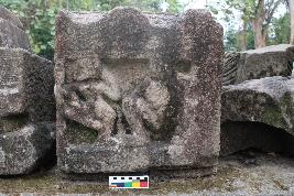 | Description / विवरण | This embellishing architectural block depicts two sunken relief human figure on the frontal side of the structure in seated posture. The structure has many perforation marks and clamp impressions on its top surface. The figure on right is shown sitting in lalitasana posture, its right arm is resting on the right thigh while its left arm is touching its head. Other features are unrecognisable and highly eroded. The left figure is shown sitting in full squat posture. The structure has been beautified with conical shape feature on top in an alignment. It also has a shallow circular carving near the left figure. |