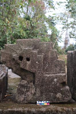 | Description / विवरण | This embellishing component depicts a triratha architectural base, it has two shallow square shape sockets on its top surface along with clamp impressions. The block has been attractively extended outwards showing the carvings of triratha features efficiently. It is also enhanced with carvings of step-like features layered one after another. The block has been placed upside down. The rathas were usually projections on a plan of the structure. Here, triratha refers to three layered projections found in temple architectures. |