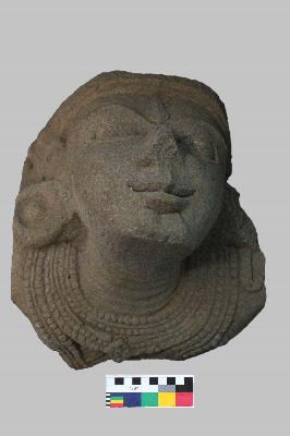 | Description / विवरण | This is a sculptural remains of an unknown figure. Above the forehead, there is the remain of a mukuta. A tilaka is visible on the forehead. Thick eyebrows with beautiful eyes are catching the attention. The nose is sharp but broken on the lower part. Philtrum part has sharply carved out and the two lips are making a graceful smile over the semi-oval shape face. Patrakundalas are visible significantly. A long neck ornamented with Upagriva, hikkasutra can be clearly seen. |