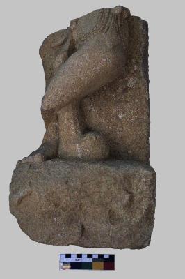 | Description / विवरण | This is a figure of a temple attendant (dwarpala)where the figure is standing over a pedestal by crossing the left leg. The fingers of the left leg are broken whereas the fingers of the right leg are present over the pedestal. The waist is ornamented with jewelry. There is a danda between the legs of the figure. A stele is visible behind the figure. |