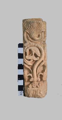 | Description / विवरण | The sculptural block shows a lovely scene of lotus with long stalk, buds and leaves are placed in interlacing pattern, which is like a creeper motif. A noticeable aspect is that in an interlacing part of the stalk, a bird like heron engages in eating food possibly a fish. This scene is depicted in more realistic way. It is noticed that in the Deoparbat Archaeological site, artists used the motif of lotus petals as side border in different architectural parts like pillar, door jambs, lintel etc. |