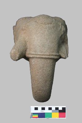 | Description / विवरण | This is a broken elephant head. The traditional headgear can be seen over the head. The right eye is clearly visible whereas the left eye is broken from the bottom. The right tusk is pointed but the left tusk is completely missing. The long trunk is decorated with a carving in the middle. |