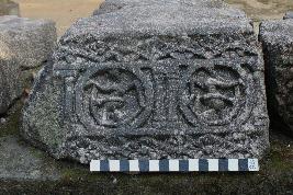 | Description / विवरण | It is an architectural fragment. The frontal part is heavily decorated. A row of diamond shapes and round floral designs are present on the top. In the middle part, there are two vidyadharas present within two circles. Which are separated by a pair of decorative columns. The two vidyadharas are holding bows and arrows and in opposite directions. Below there is another row of geometric floral designs is present. |