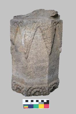 | Description / विवरण | This is a hexagonal architectural fragment that is beautifully carved out. There are geometrical designs on the upper part of the relic. On the other hand, the lower part is consisting of a pearl shape semi-circular design. |