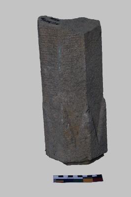 | Description / विवरण | It is a broken decorative column. It is octagonal in shape and has been decorated with pointed arrow-like design around the end of the column. A slightly elevated base has been carved. On the top surface, there is a metal clamp mark and a shallow depression. |