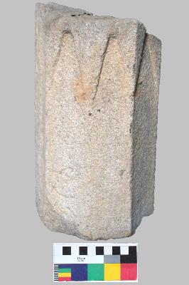 | Description / विवरण | This is a hexagonal temple fragment (broken part of a pillar) having a geometrical design in the upper part. The lower part is devoid of any decoration. |