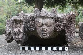 | Description / विवरण | This is a vidyadhara (wisdom-holders). Where the head is adorned with kirita mukuta. There is a tilaka on the forehead. Prominent eyebrows with well-carved eyes are present. The nose is partially broken. Lips are carved in such a way that a beautiful smile can be seen on the face. Patrakundalas are present in the ears. The right hand is holding a lotus whereas the left hand is missing. |