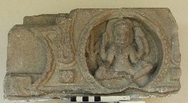 | Description / विवरण | Architectural fragment carved on front, with a four- armed goddess seated in Lalitasan in a circular sunken, oblong niche with a decorative border. The right lower hand in Varada Mudra, objects in other hand is unidentified. |