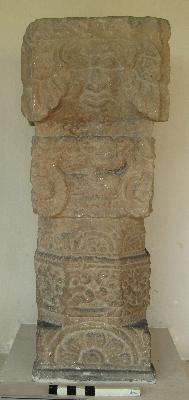 | Description / विवरण | Upper part of a pillar, with a square cap adorned on each face with a loin head (Kirti Mukha). Rest covered with well decorated floral foliage and mythological design also depicted on it. |