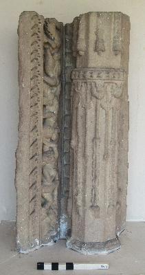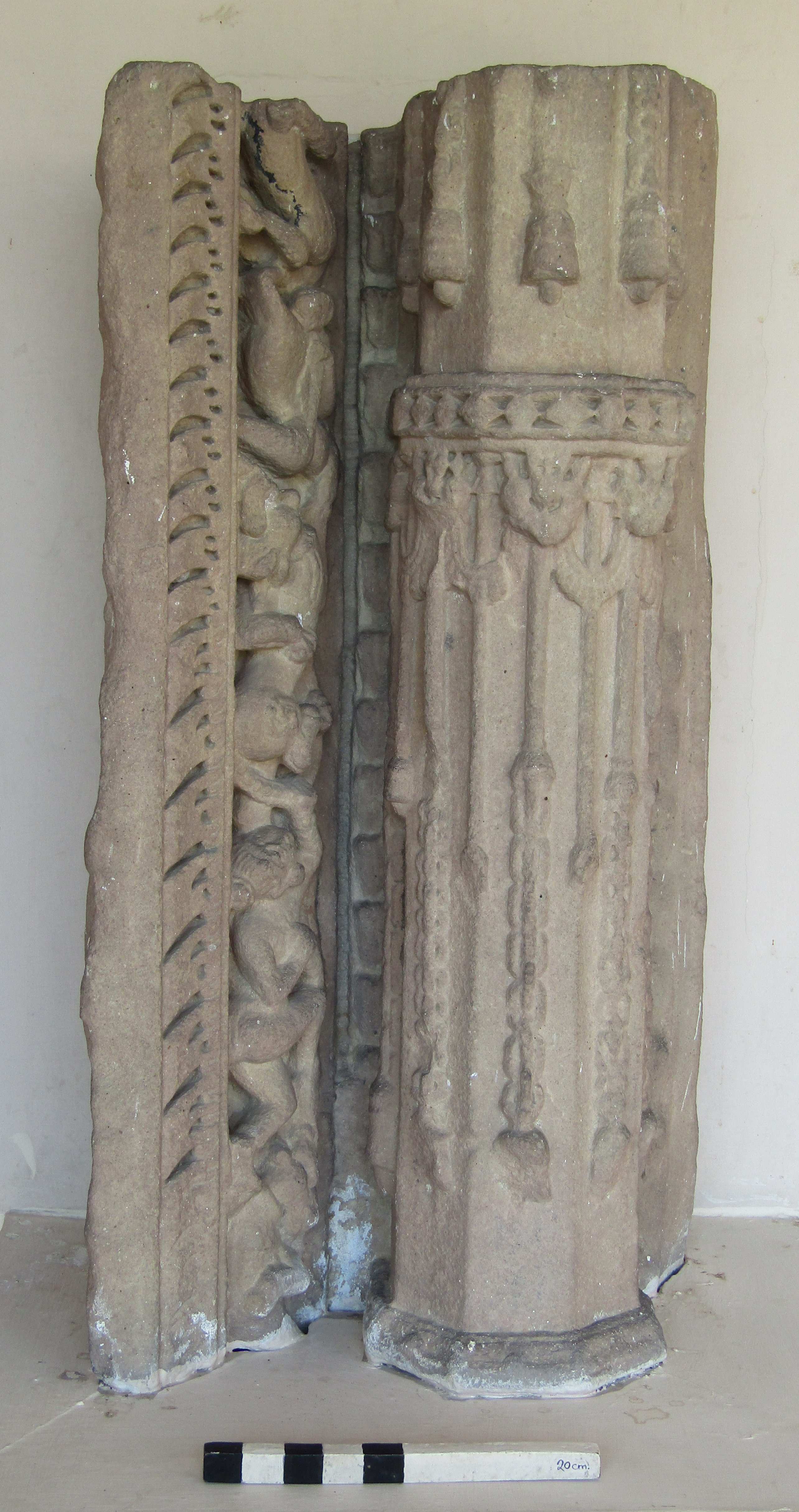 Fragment of a door-jamb, with a border of boldly executed warrior alternating with loins. The pilaster of the jamb is semi- octagonal in section and ornamented with chains with bells which issue from conventional lion s head.