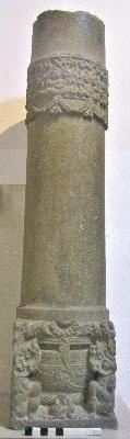 | Description / विवरण | Lower part of a column circular in section. Base moulded in the form of a vase with foliage with atlantes disposed in the four corners. Shaft is plain expect for a band of loin (Kirtimukha) heads with festoons of beads. |