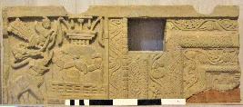 | Description / विवरण | Part of the top-piece of a door architrave, surrounded by bands of ornaments, two of which stimulate the garland pattern and two other contain flowing vine and lotus designs with bunches of grapes and leaves, lotus bud, flowers and fruits respectively. Birds are pecking at bunches of fruits. Stupas representing about Ramagrama Stupa. The Stupa is surrounded by railing of the usual type and has a smaller railing at the top.It has umbrella with fly-whisk at each side. |