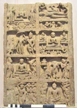 | Description / विवरण | Slab sculptured with eight principal scenes from the Buddha s life. Nativity in proper right lower corner. In proper left lower corner, Buddha s enlightenment and he is in Bhumi sparsa Mudra. In the proper right upper corner, Buddha s first sermon in the Deer park. In proper left upper corner, Buddha s demise at Kusinagara. In the panel beneath we find the Buddha s descent from the Trayastrimsa heaven at Sankasya. Beneath the Nirvana we have the miracle of Sravasti. Presentation of honey to Buddha by a monkey in the parileyyaka forest near Vaishali. The last scene, in the panel to the proper left of Buddha first ceremony, immediately above the enlightenment scene is the miracle of Rajagriha. |