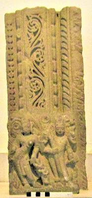 | Description / विवरण | It is a lower part of a door-jamb. At the base a group of two figures. The four armed male figure (Siva) to the proper left holds a trident and a snake, the bull is crouching behind him. To the proper right Parvati standing in tribhanga pose. |