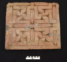 | Description / विवरण | Terracotta plaque depicts four swastika designs on one of the larger face of the plaque. All four swastika have different rotational orientation, in which each of them been shown rotating towards the outer boundary of the frame. All four swastika are enclosed within the incised border frame from the outside and is also separated by the inner incised borders. Scooping technique have been used for the carving of the design. Back side is rough in appearance and mending marks can also be seen.. |