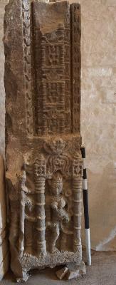 | Description / विवरण | A door jamb of some temple depicts two sculptures on its lower side in niches. The right lower figure is of an Shaivite attendant holding a long khatwanga and his face is completely lost. The second sculpture is of a female attendant holding a flower in her left hand and an unidentified object in her right hand. She bears a kiritmukuta, long earrings, necklace, armlet, waist belt etc. there is a chhatra at the top. The said sculpture is carved in a niche supported on two pilasters at the top of these pilasters a kirtimukha is depicted. The upper part of the door jamb contains 4 small niches in which various deities are depicted. |