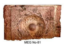 | Description / विवरण | A partly broken central ceiling slab with fully blossomed lotus bud in the centre. The lotus is depicted with two square intersected with nine sides. Foliage pattern at the corners. |