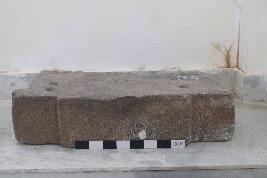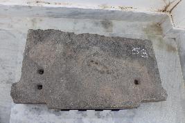 | Description / विवरण | This is a broken architectural block of a temple.Its top surface features three square-shaped sockets. The front face extends outward, creating a vertical protrusion along the sides. The frontal side of the structure is adorned with horizontally carved, step-like features. |