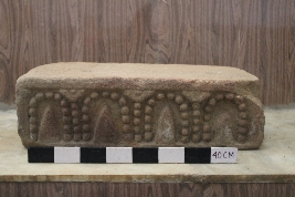 | Description / विवरण | This is a rectangular-shaped decorative block with a linear beaded string design in the shape of an arch. Between the arch, there are semi-circles with vertical beaded lines. Along with it, inside the arch design pointed triangles can be seen. The top face of the block has two sockets. This type of design is commonly found in the 8th to 12th C temple architecture of Assam |