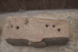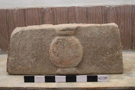 | Description / विवरण | This is a kalasha carved on an architectural block. The kalasha has simple conical top and base sections. No design can be seen on the kalasha. The top face of the block has four sockets and two clamp impressions. |