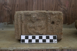 | Description / विवरण | This is an architectural block depicting a human-like figure. Along with it, two vertical lines can be seen on one side of the figure, and a linear beaded string design with a shallow carving on the other side. On the top surface, there are two square sockets and clamp impressions. From the figure on the member, it can be depicted that there was tribal influence during that period. |