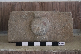 | Description / विवरण | This is a rectangular-shaped architectural block with a Kalasha carved on the front face. The kalasha has a simple conical top and base sections design can be seen on the kalasha. The top face of the block has two sockets and three clamp impressions. |