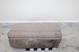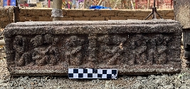 | Description / विवरण | It is a cuboidal-shaped architectural block, having beautifully carved bass relief vertical patterns resembling cord impression marks on its top surface. Following that, the block is seen bending downwards with similar patterns in a horizontal manner like that of the top surface. The bottom part of the block along with other three sides, has flat surface with no carvings on it. A clamp impression mark is carved on left edge of the block. |