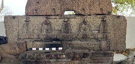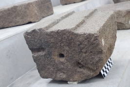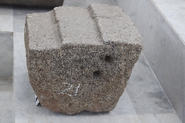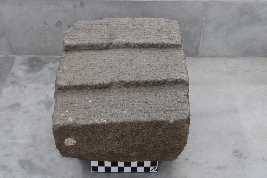 | Description / विवरण | It is a square-shaped architectural block, resembling to be a part of a temple plinth. At its top surface, the block has high-relief carvings of step-like features carved in a vertical manner that are layered on top of its other. The bottom part has a flat surface with no carvings. The right and left surface of the block has circular-shaped shallow sockets and clamp impressions carved on both sides. |