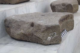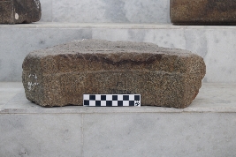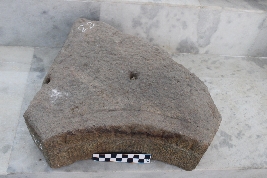 | Description / विवरण | It is an unstructured geometrical block consisting of a square-shaped shallow socket at the middle of its top surface and a clamp impression at its edge. The frontal side of the block is segmented arch in shape, enhanced with carvings of medium-relief conical-shaped posts aligned in a row. Below that, there is a carving of a horizontal stripe and bass-relief vertical patterns resembling cord-impression marks at its bottom surface. Other side have rough surfaces with no carvings on it. |