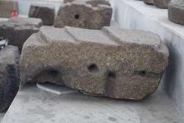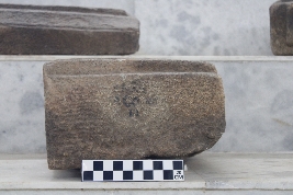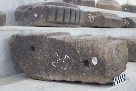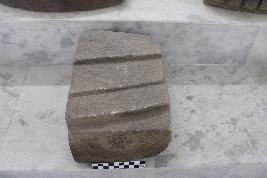 | Description / विवरण | It is a cuboidal-shaped architectural block, resembling to be a part of temple architectural base. It has circular shape shallow sockets and clamp impressions on both the left and right side of the block. The frontal side of the block consists of broad step-like features, that were carved in a vertical manner, layered on top of each other. The lower part has flat surface with no carvings on it. |