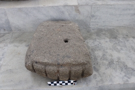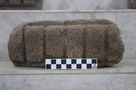 | Description / विवरण | It is a trapezoidal-shaped broken architectural fragment consisting of a circular-shaped shallow socket at its top surface. The frontal side of the block is enhanced with high-relief carvings of broad rectangular plates in a vertical manner, that were aligned in a row. The carvings were similar to that of amalaka. |