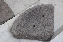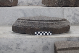 | Description / विवरण | It is broken fragment of a pedestal, found in temple architectures. Only a half-circular triangle shape is present, other parts were sadly broken. The block has carvings of two square-shaped shallow sockets at its middle part of topmost surface. Its uppermost frontal part has a sunken-relief carving of horizontal stripe, below that, the surface is inclined downwards. The bottom surface has bass-relief carvings of vertical stripes similar to that of cord-impressed marks, followed by a horizontal stripe. Other sides of the block has flat surfaces with no carvings on it. |