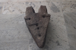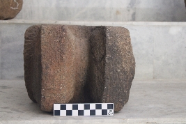 | Description / विवरण | It is a triangular-shaped broken fragment of an amalaka, consisting of many sockets along with clamp impressions at its top surface. The frontal side of the block is enhanced with two high-relief carvings of broad rectangular plates in a vertical manner, that were aligned in a row. It also has bass relief carvings of vertical lines similar to cord impressed marks on the blocks. The amalaka is part of the Hindu temple architecture seated on top of the shikhara. |