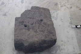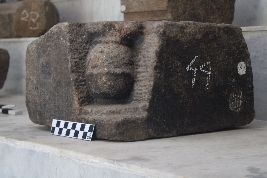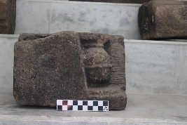 | Description / विवरण | It is a trapezoidal-shaped architectural fragment, consisting of a sunken relief carving of a kalasha at its frontal left corner of the block. The kalasha has a very prominently carved rim and base part along with a high-relief carving of a horizontal ring at its middle part of the body. Apart from this, the entire block has bass-relief carvings of vertical and horizontal lines that were similar to cord-impressed marks. The block also has two square-shaped shallow carving of sockets at its top surface. |