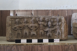 | Description / विवरण | This is a stone panel that depicts a scene with several human figures. Based on the image, it s safe to assume that there was a tribal influence during that period. The figures are wearing kayabandhi and antariya. A v-shaped beaded design can be seen on one side of the adjacent face, while sockets and clamp impressions are visible on the top face. The rest of the details are unclear. |